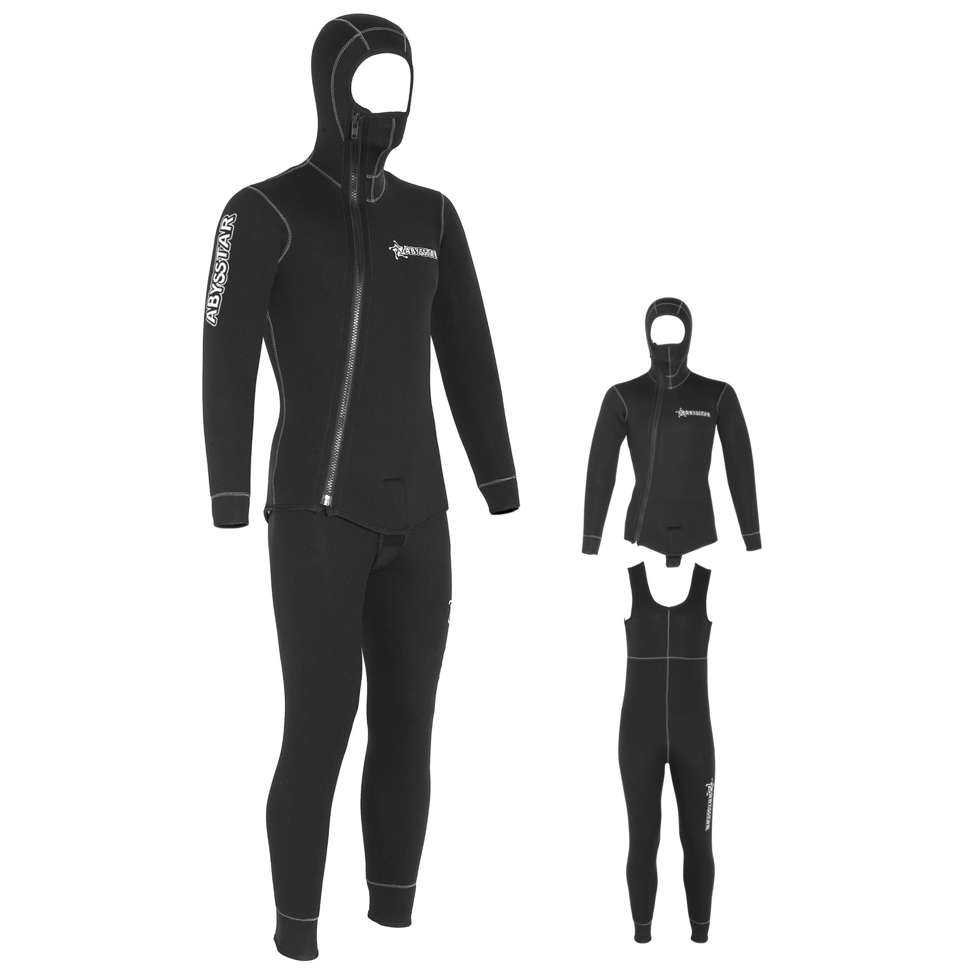 Muta a due pezzi con cerniera facciale in neoprene dA 3/5 mm, taglio preformato. Esterno foderata in nylon e interno plush.