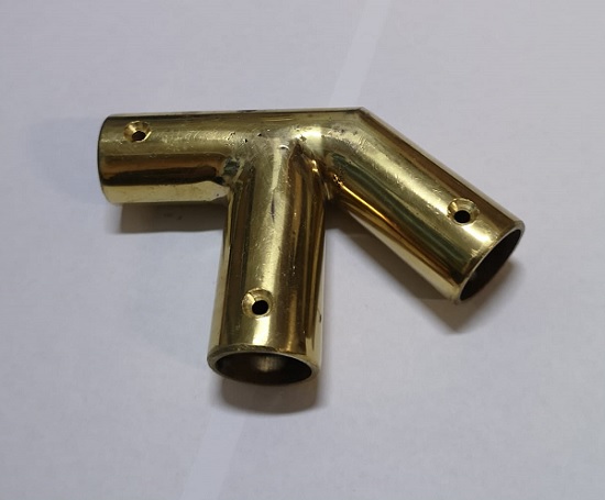 Raccordo a 3 vie in ottone per tubolare da 25 mm, con inclinazione da un lato per 45°. Pezzo davvero singolare, in microfusione di produzione artigianale, con fori laterali per vite da 4 mm.