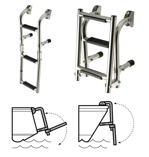 Scaletta pieghevole in Acciaio Inox con interasse stretto. Gradino rivestito con materiale composito antisdrucciolo.